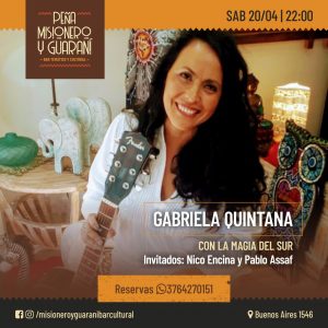 Después de hacer un recorrido por escenarios del sur, Gabriela Quintana ya es parte del Litoral. Tal es así que es asidua invitada a compartir escenario con Los Encina o Cecilia Prieto, “La dulce voz del Paraná”, haciendo que la distancia inmensa que separan el sur y el norte quede resumida en un acorde de hermandad.