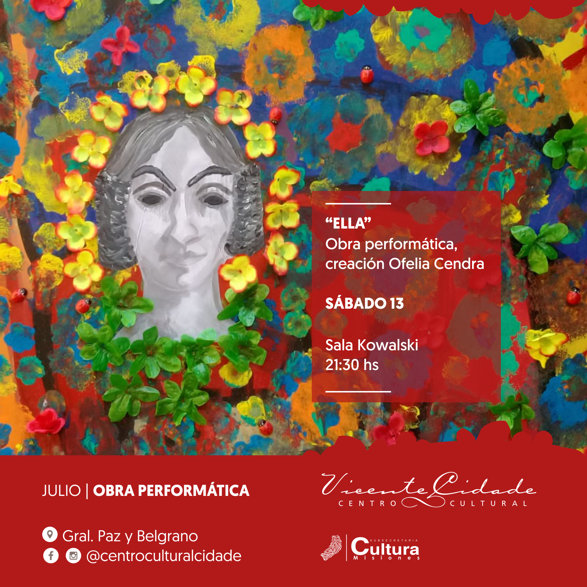 Ella – obra performática: El sábado 13 de julio a las 21:30 horas en la Sala Kowalski se desarrollará “Ella – obra performática”, espectáculo intimista en estilo café concert, con música en vivo, invitados, instalación artística, barra de tragos y bocados, todo bajo la dirección de Ofelia Cendra. Entradas $ 200