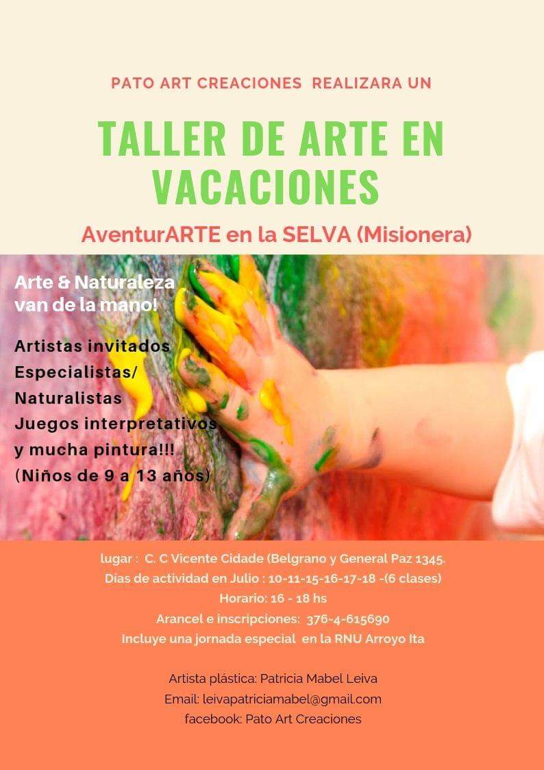 Taller de Arte en Vacaciones: Desde el 10 de Julio la artista plástica Patricia Mabel Sosa propone un taller de 6 clases denominado “AventurARTE en la selva (misionera)”, destinado a niños de 9 a 13 años, a manera de entretenimiento de la mano del arte. Pintura, juegos interpretativos, con artistas invitados para compartir experiencias en temas de naturaleza y medio ambiente. Una de las jornadas se realizará en la RNU Arroyo Itá. Para más información comunicarse a: [email protected] o vía celular: 3764 615690.