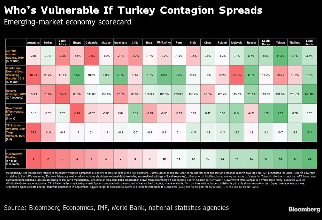 Cinco factores explican el primer puesto de la Argentina en el podio de los países más vulnerables de Bloomberg: un muy elevado ratio de deuda externa de corto plazo sobre el PBI (40,5 %), una desviación de 35,8 puntos de la inflación por encima de la meta que regía hasta septiembre del año pasado (10%), un muy bajo ratio de Reservas Internacionales de cobertura, un déficit de cuenta corriente del 2 % del PBI y una “pobre efectividad” del gobierno.