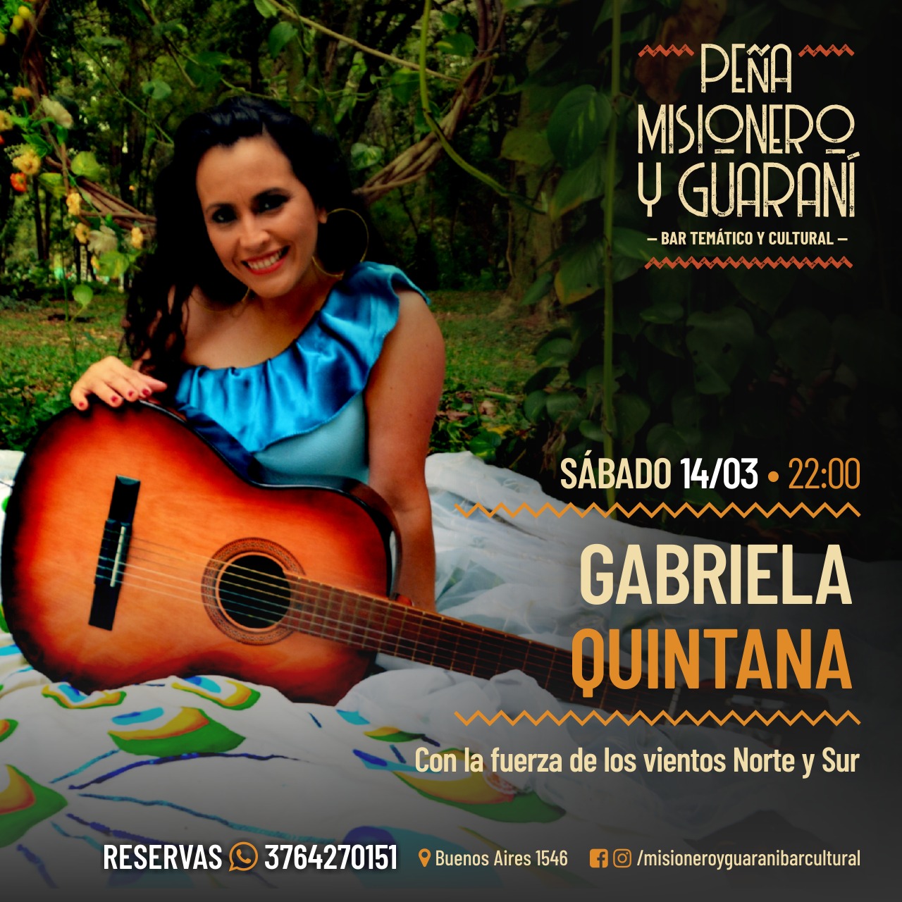 Después de recorrer innumerables escenarios del Sur, los vientos cálidos del litoral la llamaron a seguir cumpliendo sueños. Es así que Gabriela Quintana lleva varios años por esta tierra colorada llevando los ritmos de su tierra natal como también el de muchas regiones de nuestro país.