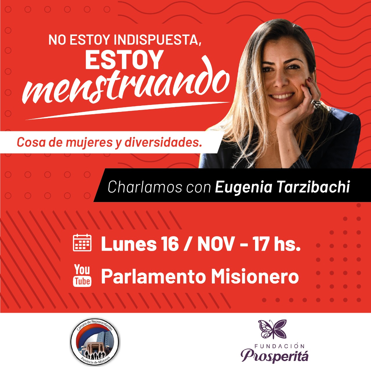 La Cámara de Representantes de la Provincia de Misiones invita a asistir virtualmente a la charla “No estoy Indispuesta, Estoy Menstruando: Cosa de Mujeres y Diversidades” con la Dra. Eugenia Tarzibachi, psicóloga, psicoterapeuta y autora del libro “Cosa de Mujeres: Menstruación, Género y Poder”, oradora de lujo en este evento impulsado por las diputadas Anazul Centeno y Laura Duarte que será transmitido en vivo por el canal de Youtube del Parlamento Misionero el próximo lunes 16 de noviembre a las 17:00 hs.