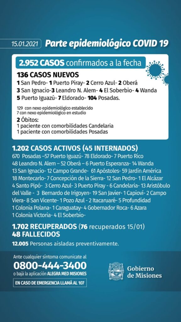Por otra parte 12005 personas continúan con el aislamiento domiciliario por 14 días. Cabe recordar que Misiones tiene 1202 casos activos de coronavirus, 1702 personas se han recuperado y 48 han fallecido.