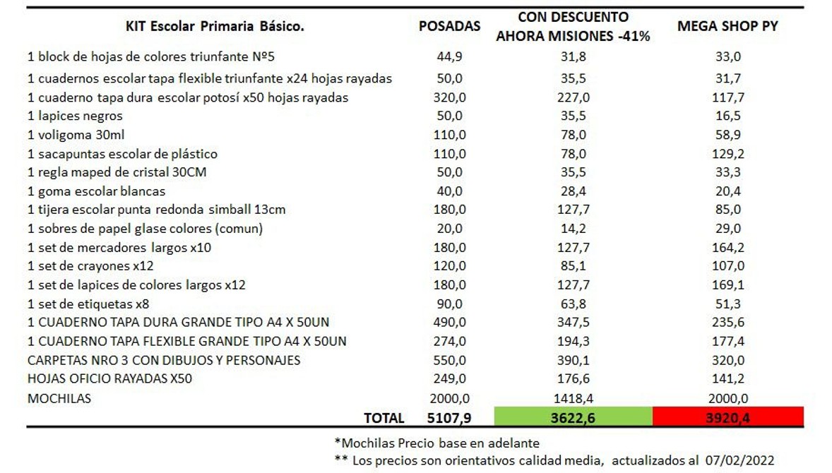 La comparativa que ofreceremos a continuación es la de un kit escolar básico para un alumno de escuela primaria en librerías de Posadas y Encarnación. Los precios son orientativos, en pesos, entre marcas de media calidad en un comercio encarnaceno y un promedio de librerías posadeñas. Recordemos que además de la cuestión cambiaria, la provincia cuenta con Programas como el “Ahora Misiones +21” que ofrece un importante reintegro en las compras que se puede apreciar en la segunda columna del cuadro, donde se muestra el descuento de 41% aplicando el descuento del mencionado Programa sobre los precios expuestos en la columna uno “Posadas” para compararlos con los precios de Mega Shop Paraguay.