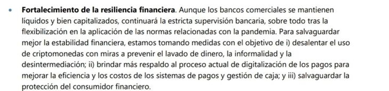 En la página 19, de las 44 que incluye el documento para cerrar el acuerdo con el FMI, el último punto del apartado dedicado a las “Políticas de crecimiento y resiliencia”, señala: “Para salvaguardar mejor la estabilidad financiera, estamos tomando medidas con el objetivo de desalentar el uso de criptomonedas con miras a prevenir el lavado de dinero, la informalidad y la desintermediación”.