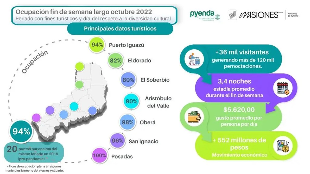Fue el ministro de Turismo, José María Arrúa, quien difundió a través de sus redes los primeros datos del balance realizado, que arroja más de $552 millones y ocupación promedio del 94% en todo el territorio. Este último dato está 20 puntos por sobre los valores obtenidos en el mismo feriado pero del año 2019, en la pre-pandemia.