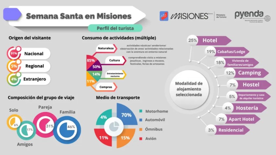 Misiones se lució en Semana Santa con una gran convocatoria en todos sus atractivos. Según datos brindados por el Ministerio de Turismo de Misiones, la provincia recibió más de 51 mil viajeros, registró más de 160 mil pernoctes con 3,8 noches promedio de estadía. La ocupación de alojamiento promedio llegó al 93%, lo que significa un aumento de cuatro puntos en comparación con el mismo periodo del año anterior, teniendo en cuenta que el crecimiento de la oferta fue de un 14%.