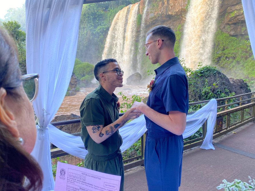 Benjamin Shropshire (Canadá) y Manuel Santiago (Venezuela), tras años de mantener una relación a distancia, lograron contraer matrimonio en el Parque Nacional Iguazú, inaugurando así la legislación que habilita el casamiento en atractivos turísticos misioneros.
