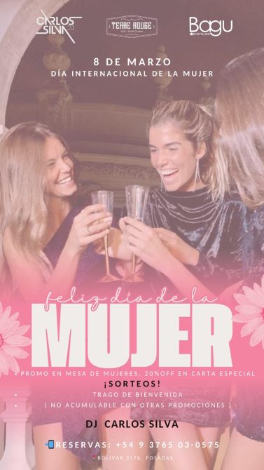 La segunda propuesta sucederá también por la noche en Terre Rouge donde se realizará una cena dedicada a celebrar el día de la mujer en la cual, habrá descuentos en la carta y copa de bienvenida, la jornada nocturna estará musicalizada por el Dj Carlos Silva.