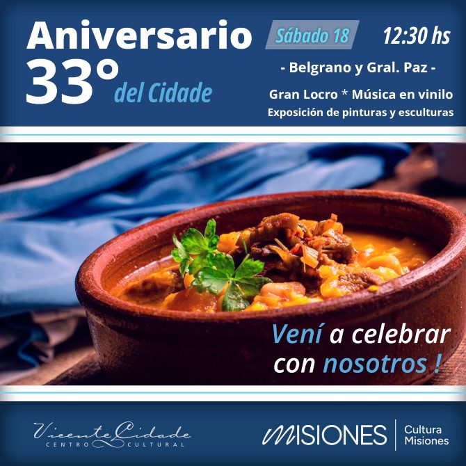 Con motivo de celebrarse los 33° aniversario del Centro cultural Vicente Cidade (Belgrano y General Paz), institución emblemática bajo la órbita de la Secretaria de Cultura de la provincia, este sábado invita a toda la comunidad artística y vecinos a ser partícipe de los festejos que se desarrollaran frente al edificio desde las 12:30 del mediodía, en el cual se podrá degustar de un exquisito locro mientras se podrá recorrer una exposición de cuadros, todo acompañado de música en vinilo de la mano de la vieja guarda de Djs conformada por Daniel Allosa, Marcelo Ciganda, Guido Allosa y Coco Jara, integrantes del programa radial “Al disco” que se emite por radio Circus.