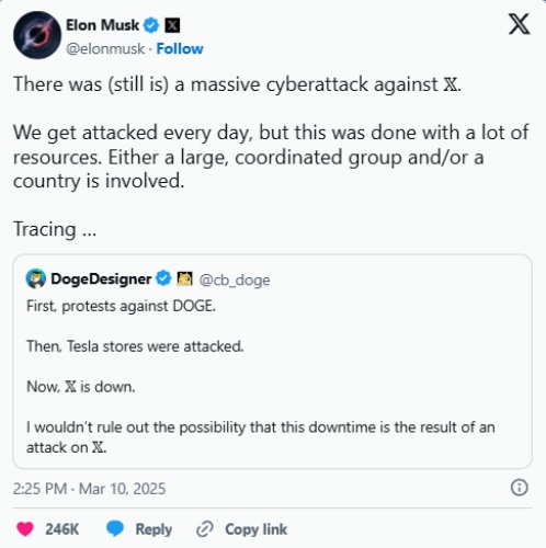 “Nos atacan todos los días, pero esto se hizo con muchos recursos”, aseguró Musk en una publicación. “Está involucrado un grupo grande y coordinado y/o un país. Rastreando”, agregó el director ejecutivo.