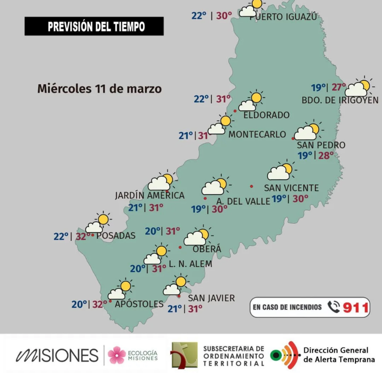 El pronóstico del tiempo en Misiones para este miércoles 11 de marzo anticipa una jornada calurosa, con cielo parcialmente nublado y temperaturas máximas que volverán a ubicarse por encima de los 30 °C en gran parte de la provincia.