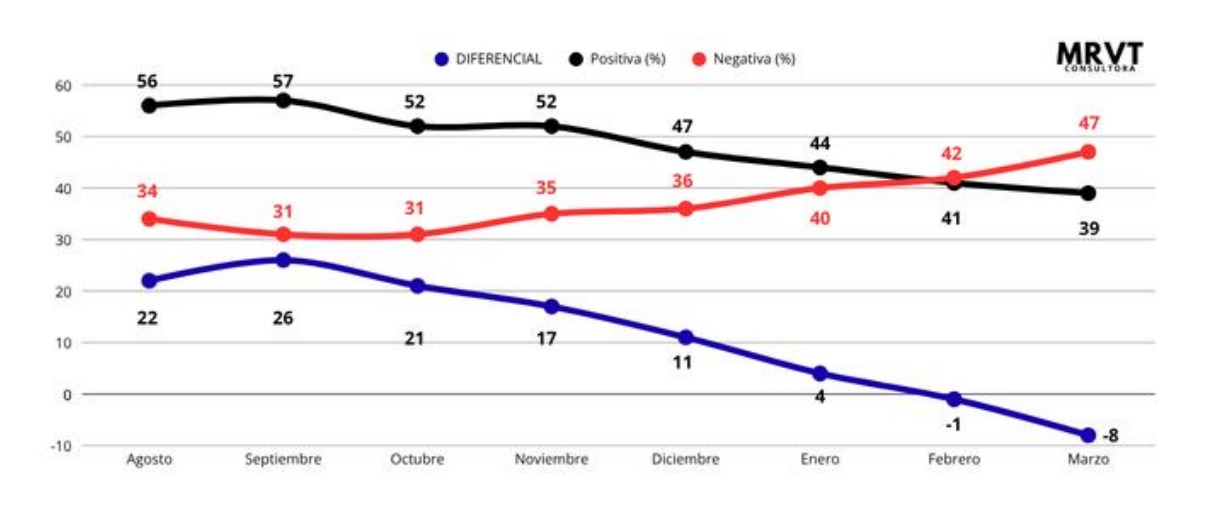 La evolución del diferencial neto —que mide la distancia entre imagen positiva y negativa— es aún más contundente. Pasó de +26 puntos en septiembre a -8 en marzo, lo que implica una caída de 34 puntos en apenas siete meses.