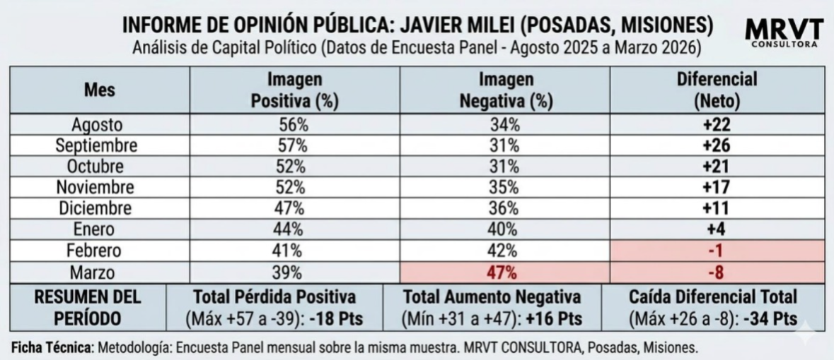 Un informe de MRVT Consultora expone un deterioro sostenido en la imagen del presidente Javier Milei en la ciudad de Posadas, Misiones, con una caída de 18 puntos en su valoración positiva entre agosto de 2025 y marzo de 2026.