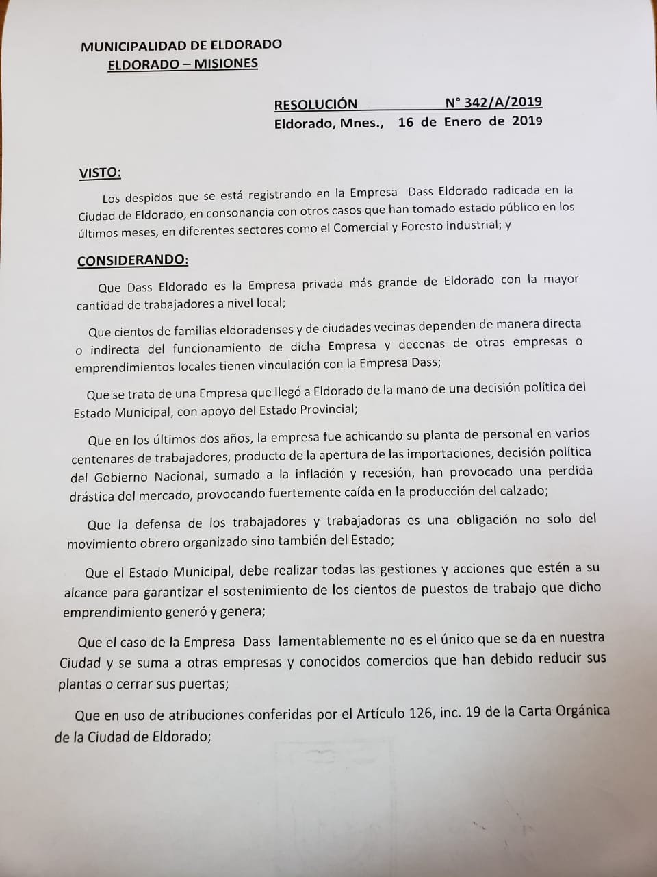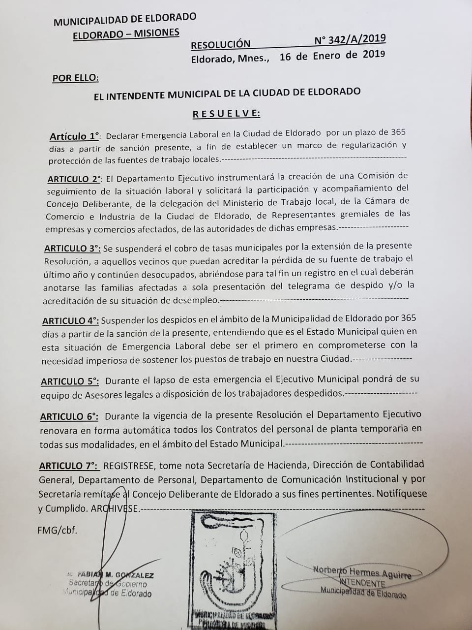 Por resolución 342/A/2019 el intendente Norberto Aguirre resolvió declarar en la ciudad de Eldorado la emergencia laboral, por un plazo de 365 días a partir de hoy a fin de establecer un marco de regularización y protección de las fuentes de trabajo locales.