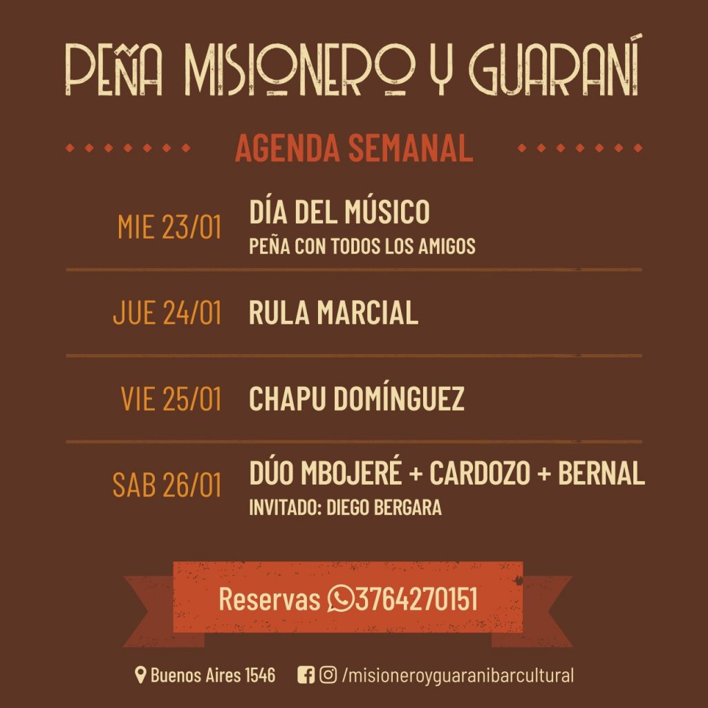 El miércoles 23, coincidiendo con el cumpleaños de Luis Alberto Spinetta se celebra el Día Nacional del Músico, y la peña será epicentro de un gran encuentro de amigos y artistas. El jueves llega Rula, el viernes el Chapu Dominguez y el sábado, un combo de lujocon CachoBernal, el Maestro arpista Milan Cardozo y Frodo Peralta en una noche con la música como estrella principal. Reservas al 376-4270151.