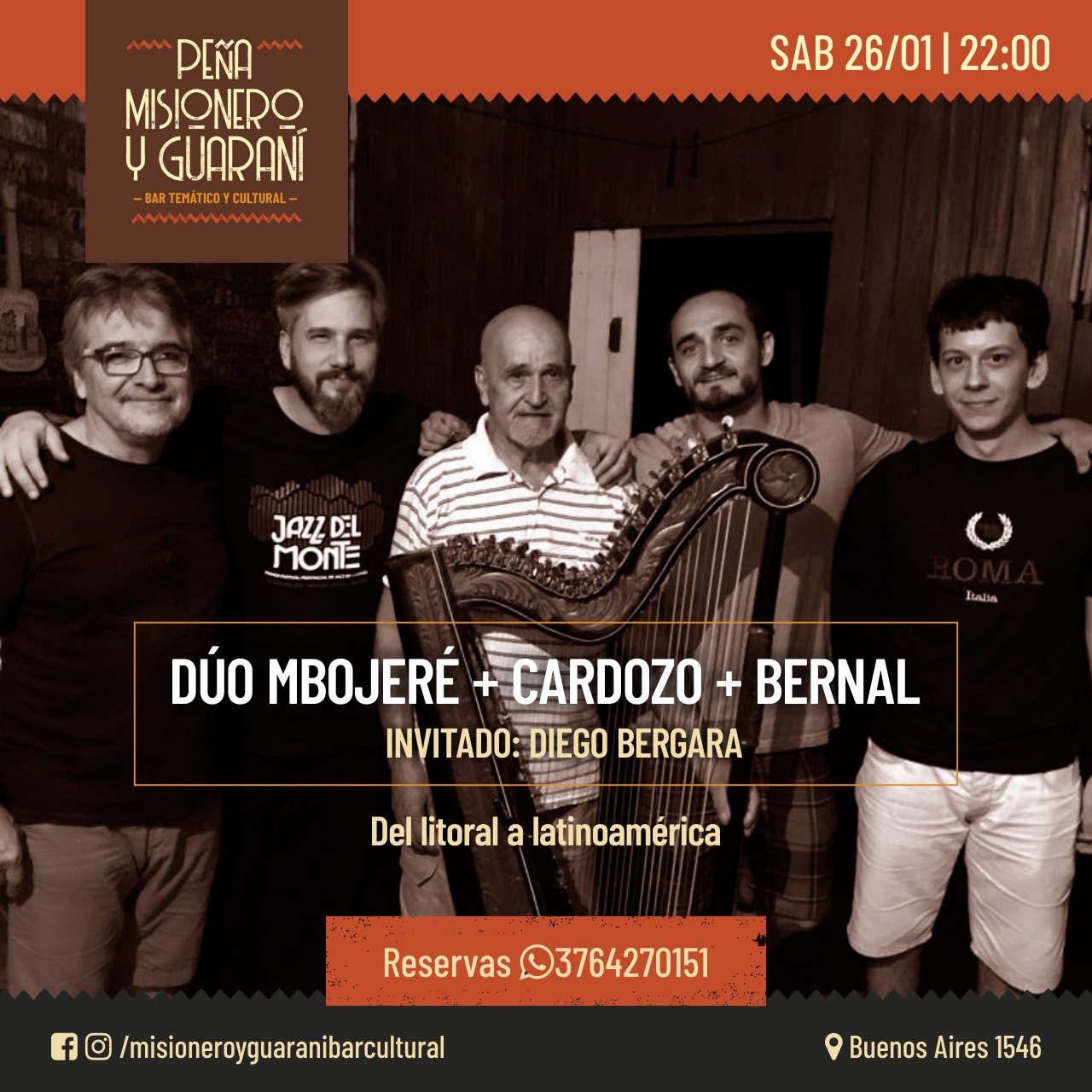 Reunir en un mismo escenario al maestro arpista y luthier Milan Cardozo y a Cacho Bernal, de por sí es un hecho inédito, y si a ello le sumamos el dúo Mbojeré ( Frodo Peralta -compañero de Cacho en Matereré- y Gaspar Macor), ya estamos hablando de una confluencia de arpa, guitarras ( Frodo toca una de 7 cuerdas) y percusión que nos traerá un repaso de música latinoamericana y regional: Así, tendremos choro, vals, chamamé, rasguido doble y polca, entre varios más. Además, la presencia de Diego Bergara, quien regará todo con el power de los sonidos más bajos del espectro. Sin dudas, una noche de excelencia musical e ideal para compartir entre amigos.
