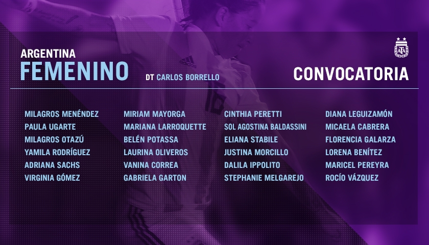 El listado completo de las convocadas es: Milagros Méndez, Paula Ugarte, Milagros Otazú, Yamila Rodríguez, Adriana Sachs, Virginia Gómez, Miriam Mayorga, Mariana Larroquette, Belén Potassa, Laurina Oliveros, Vanina Correa, Gabriela Gartón, Cinthia Paretti, Sol Baldassini, Eliana Stábile, Justina Morcillo, Dalila Ippolito, Sthepania Melgarejo, Diana Leguizamón, Micaela Cabrera, Florencia Galarza, Lorena Benítez, Maricel Pereyra y Rocío Vázquez.