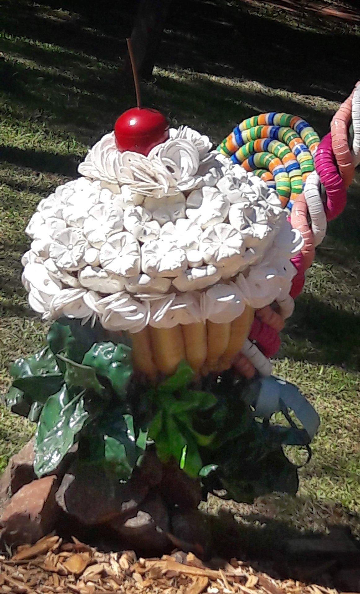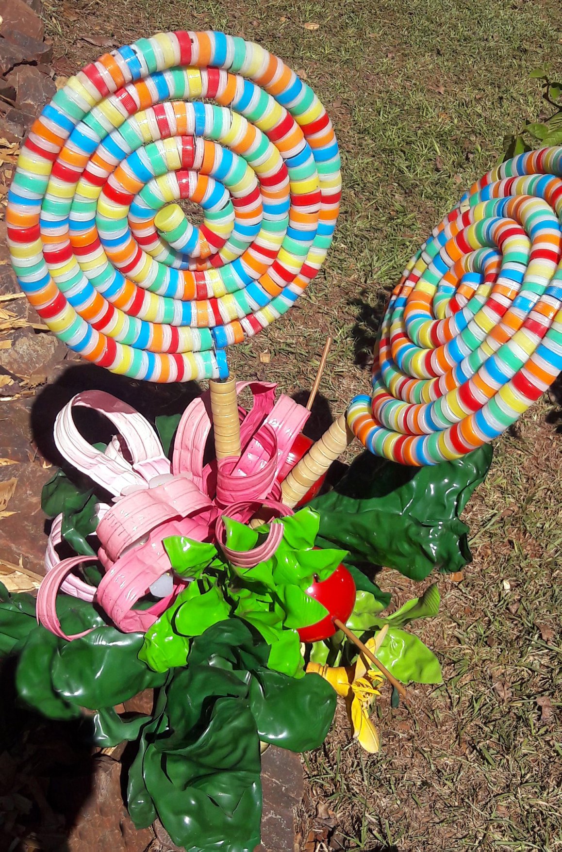 Usando botellas y tapitas de plástico los encargados de vestir de fiesta al pueblo, otra vez sorprendieron a vecinos y visitantes con obras que se destacan no solamente por su tamaño, también por su originalidad y nivel de detalle.