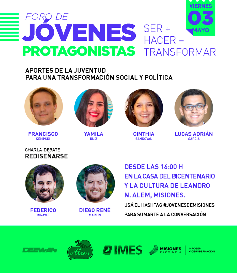 El viernes 3 de Mayo, a las 16 horas, se realizará en la Casa del Bicentenario de la ciudad de Leandro N. Alem, el Foro de Jóvenes Protagonistas “Ser + Hacer = Transformar”. Será un espacio de debate, integración y construcción de conocimientos con una dinámica descontracturada.