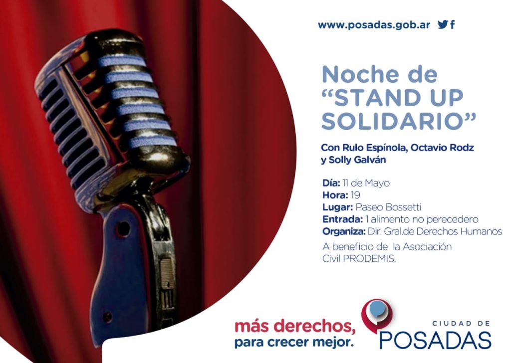 El sábado 11 de mayo a partir de las 19 horas, la Municipalidad de Posadas ofrecerá por primera vez, una noche diferente para que disfruten del humor de los reconocidos comediantes locales: Octavio Rodz, Fernando Rosa “Rulo Espínola” y Solly Galván, quienes solidariamente aceptaron participar de esta iniciativa.
