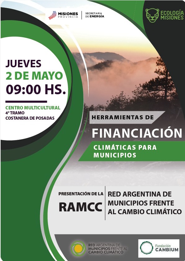 Hoy desde las 9:00 h presentan en el espacio Multicultural del Cuarto tramo de la avenida Costanera de la ciudad de Posadas, se realizará la presentación de la Red de Financiación Climáticas para Municipios frente al Cambio Climático. Esta actividad se encuentra organizada por el Ministerio de Ecología y de RNR y la Secretaria de Energía con el apoyo de la Fundación Cambium.