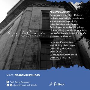 Cidade Maravilloso: 28 años junto al arte: El próximo sábado 18 de mayo el Centro Cultural Vicente Cidade cumple un año más, y como es habitual la fecha se celebra con artistas y público. Este año se inaugurará una Exposición Colectiva de Artistas Plásticos Misioneros, a quienes se convoca a exponer hasta dos obras en cualquiera de las disciplinas de las artes visuales: pintura, dibujo, fotografía, escultura, grabado, objetos, instalaciones y nuevas tendencias. . La invitación es abierta a compartir este aniversario, a partir de las 21 horas. Amenizarán la velada La Orquesta Folklórica, Guaynamérica Danza, Berenice Oliveira, Lean Acuña y el grupo musical La Guitarreada.