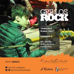 Grillos Rock 10 años – Vol. I: El domingo 12 mayo en la sala Quiroga, en doble función, a las 18:00 y a las 20:00 horas los Grillos Rock estarán realizando un espectáculo musical denominado “Grillos Rock 10 años – Vol. I”, para conmemorar su primera década de vida. En dicho show se interpretarán canciones de artistas y bandas como The Beatles, Soda Stereo, Queen, Charly García, Fito Páez, entre otros. Entradas $100