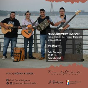 Presentación de disco: El viernes 17 de mayo a las 21:00 horas en la Sala Horacio Quiroga del Centro Cultural Cidade, el grupo Retumbo Pampa presentará su primer material discográfico de estudio denominado “RPM”. Entrada $ 150.