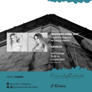 Primera gala del año: El jueves 2 de mayo en la Sala Quiroga a las 20:30, la Academia Superior de Danzas Habibi a cargo de la directora profesora Amira Rojas inicia su primera gala del año denominada Bautismo Habibi 2019, donde las alumnas nuevas reciben un bautismo simbólico y son bienvenidas por la directora, profesoras e instructores y público en general. Entrada $ 200