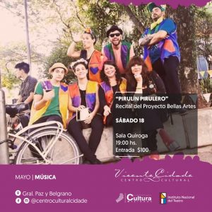 Recital de Pirulín Pirulero: El sábado 18 de mayo a las 19:00 horas en la Sala Horacio Quiroga hará su presentación en sociedad el Proyecto Bellas Artes, con el grupo musical Pirulín Pirulero. Se trata de un grupo de artistas multidisciplinario cuyo objetivo es generar performances destinados a la platea menuda, pero que incluye la participación de los entornos familiares. Su eje es un recital con repertorio que homenajea a grandes autores de la canción infantil. Con Ofelia Cendra a la cabeza y un grupo de conocidos músicos locales, será sin dudas un buen espacio de entretenimiento para grandes y chicos. Entradas $ 100