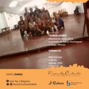 Sabor Latino en el Cidade: El viernes 24 de mayo a las 21:30 horas, en la sala Quiroga del Centro Cultural Cidade, se realizará la primera muestra de clases de la Academia de Diego Alfonso y Nanci Domínguez, también habrá presentación de los primeros egresados del Instructorado de ritmos caribeños de Pablo Padrón. Entrada $ 150.