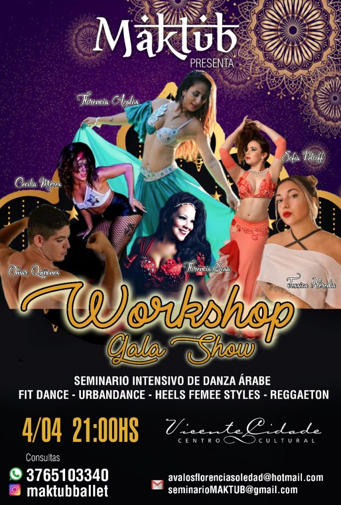 Workshop gala-show: El sábado 4 de mayo en la Sala Quiroga a las 21:00 horas se realizará una gala show a cargo de la academia de danza “Maklub” de la profesora Florencia Avalos. Desde 8:30 hasta las 16:00 horas se dictará un Workshop en el cual se unificarán los diferentes estilos de danzas que tiene nuestra provincia. Para consultas e inscripciones comunicarse al 376 510-3340.