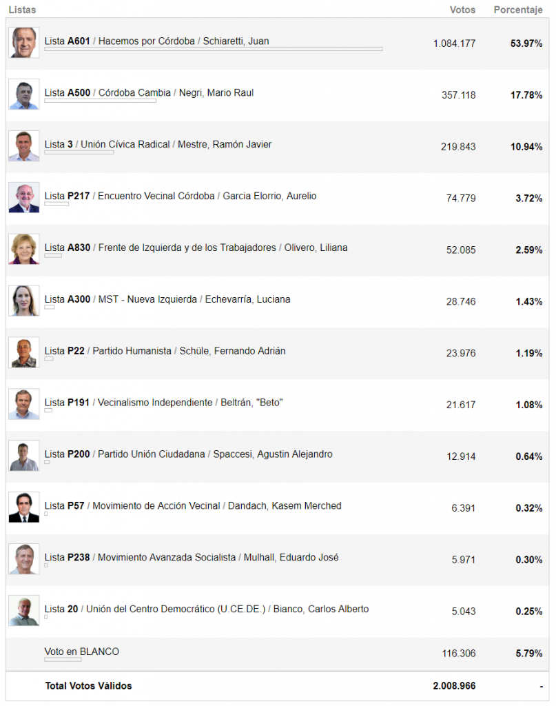 Los comicios arrojaron que Schiaretti (Hacemos por Córdoba) obtuvo al momento el 53,97%; Mario Negri (Córdoba Cambia) 17,78%; Ramón Mestre (UCR) 10,94%; Aurelio García Elorrio (Encuentro Vecinal Córdoba), 3,72% y Liliana Olivero (Frente de Izquierda y los Trabajadores) 2,59%.