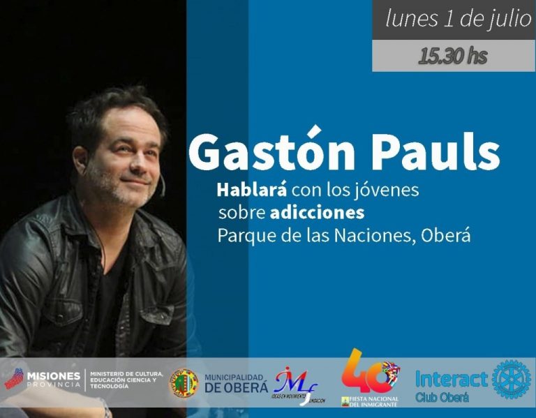 Este lunes 1ro de julio a las 15:30 h, en el Parque de las Naciones, el reconocido actor Gastón Pauls hablará con los jóvenes obereños sobre adicciones. El encuentro es organizado por la fundación “Ideas en Movimiento” con el apoyo del Ministerio de Cultura, Educación, Ciencia y Tecnología, la Municipalidad de Oberá y el Interact club Oberá.