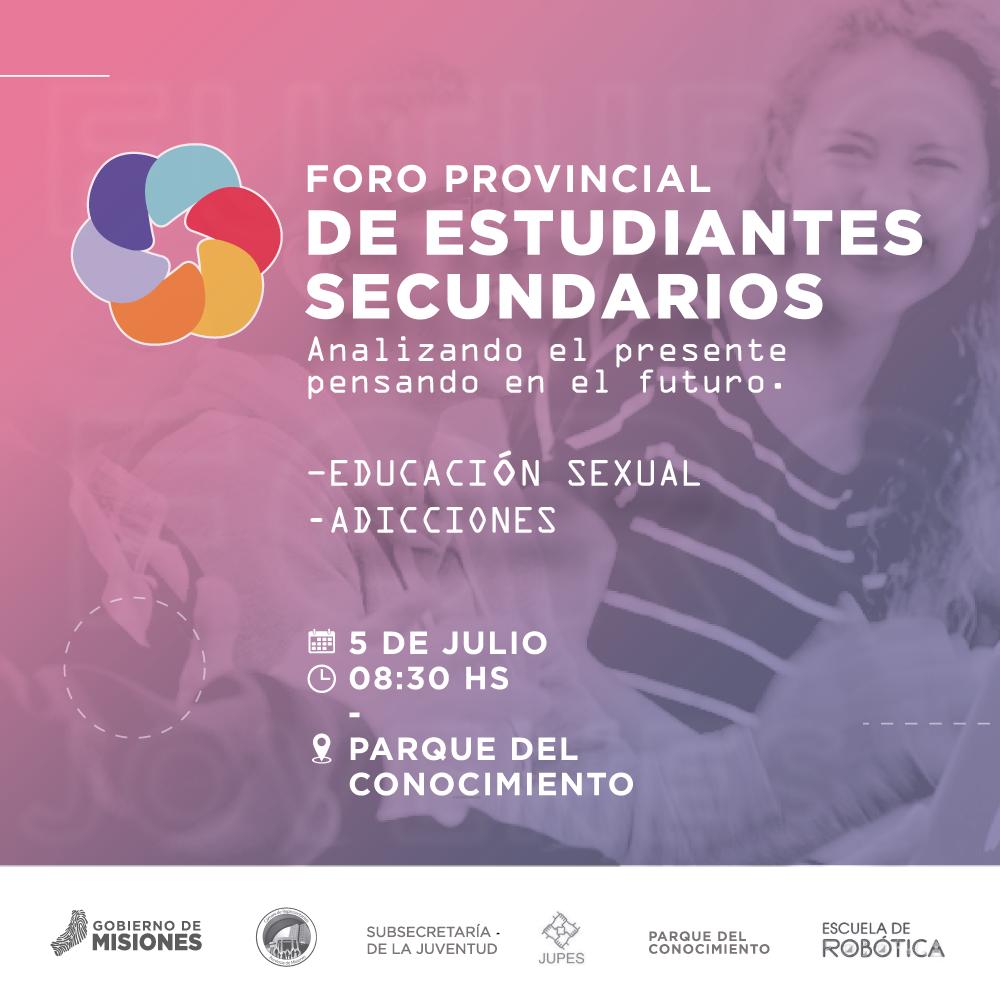 El viernes 5 de Julio, a las 8.30 horas, se llevará a cabo el primer foro de estudiantes secundarios de la provincia en el Parque del Conocimientos donde se desarrollaran charlas talleres sobre educación sexual y adicciones, además un recorrido por el observatorio y el Imax.