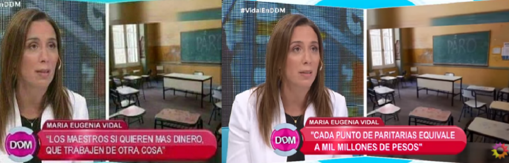 Según las publicaciones, en una entrevista televisiva en el programa “El diario de Mariana”, que conduce Mariana Fabbiani, Vidal habría dicho: “Los maestros, si quieren más dinero, que trabajen de otra cosa”. En la misma imagen se puede ver una pantalla partida donde, de un lado, aparece la mandataria bonaerense en el piso de Canal 13 y, del otro, un aula con mesas y sillas vacías y la palabra “Paro” en un pizarrón verde.