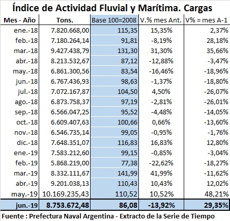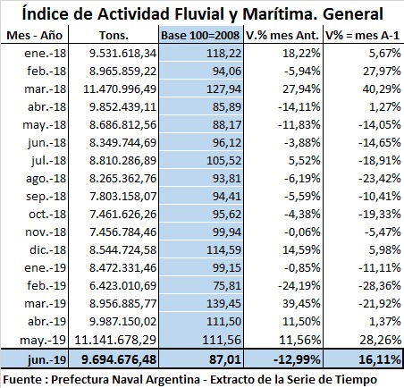 Según el AFM, en el primer semestre de 2019, en lo que respecta al total de toneladas transportadas (más de 54,6 millones), se presentó una caída del 3,84% comparado con igual semestre de 2018. Esta caída, representa una pérdida de volumen en cargas y descargas de mercaderías de más de 2,1 millones de toneladas. A su vez, si se compara con el segundo semestre de 2018, la actividad fluvial y marítima en total creció un 13,10%, lo que simbolizó un aumento de 6,3 millones de toneladas, marcando una clara mejora con ese período de doce meses, en el cual se cargaron y descargaron un total de más de 103 millones de toneladas.