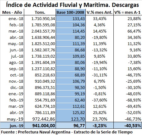 Con referencia a las descargas de productos medidas en toneladas operadas (importaciones), en el mes de junio se experimentó una nueva caída del 3,23% respecto al mes de mayo, con un total de 941 mil toneladas, cayendo también interanualmente un 40,53%. Durante el primer semestre de 2019, el total de toneladas descargadas fue de más de 4,7 millones, que, comparado con igual semestre de 2018, representa una caída del 54,96%, esto simbolizó una pérdida de volumen de más de 5,8 millones de toneladas. A su vez, si lo comparamos con el segundo semestre de 2018, la actividad fluvial y marítima con referencia a las operaciones descargas de mercaderías, cayo 32,13%, lo que representa una pérdida de más de 2,2 millones de toneladas. Durante el periodo que va desde julio de 2018 a junio de 2019 el total de toneladas descargadas fue de 11,7 millones.