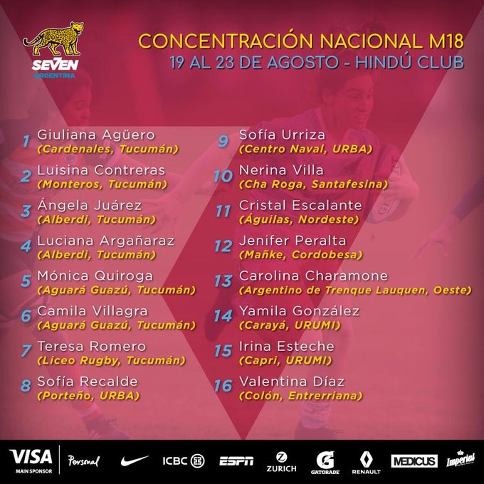 Entre las 16 elegidas por Villén, son siete las tucumanas que integran el listado. Se trata de Ángela Juárez y Luciana Argañaraz de Alberdi Rugby, Mónica Quiroga y Camila Villagra de Aguará Guazú, el club de Aguilares, Luisina Contreras de Monteros Vóley, Giuliana Agüero de Cardenales y Abril Romero de Liceo Rugby.