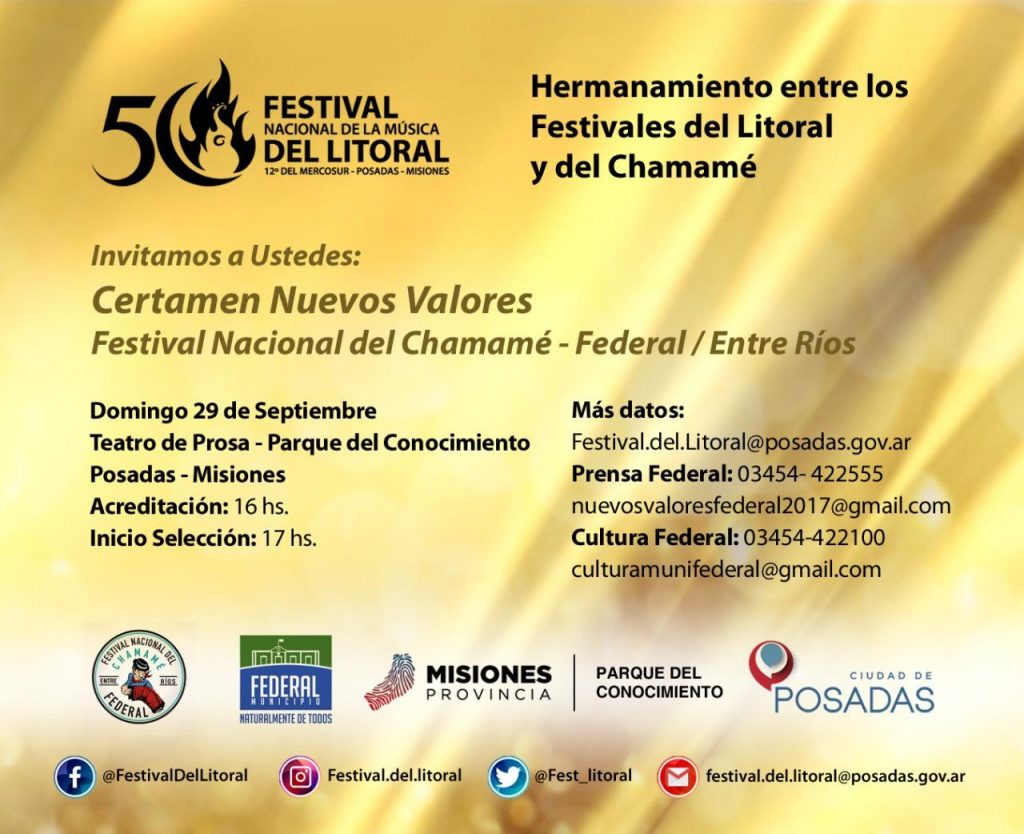 En el marco del hermanamiento entre el Festival Nacional de la Música del Litoral, de Posadas (Misiones) y el Festival Nacional del Chamamé de Federal (Entre Ríos), ambas celebraciones buscan la promoción y difusión de las nuevas generaciones de compositores e intérpretes que abrazan las expresiones regionales. Por ello, en las dos ciudades se realiza la búsqueda de Nuevos Valores.