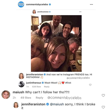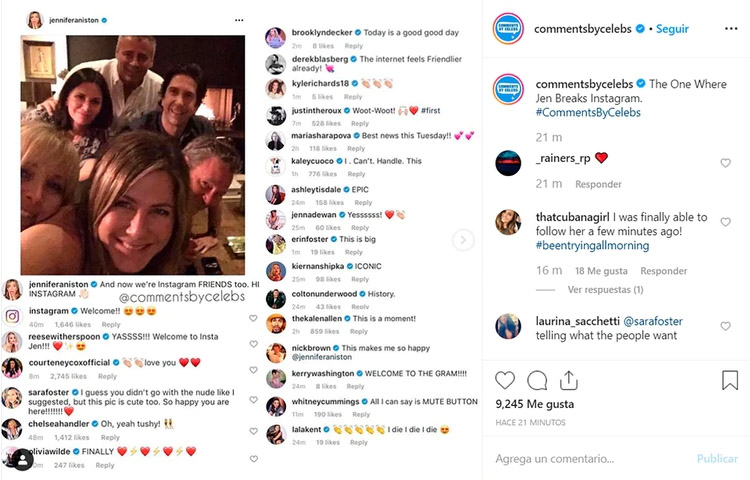 En pocos minutos, la imagen de Aniston y sus ex compañeros de elenco ya había cosechado más de 500 mil “me gusta” y miles de comentarios de sus nuevos seguidores. Entre ellos, famosos como Resse Witherspoon y Kaley Cuoco que le dieron la bienvenida a la red social. Su ex esposa, Justin Theroux, también le dejó un simpático comentario.
