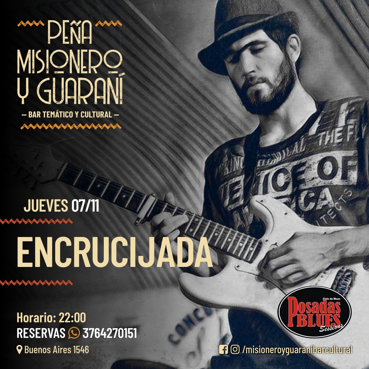 Una nueva edición del ciclo de blues en La Peña. En esta oportunidad nos visita Encrucijada, un proyecto del guitarrista Rodrigo Negro fundado en el año 2014 en la ciudad de Eldorado. En sus comienzos incursionó en el rock y en blues tradicional, para más tarde abordar otros géneros como el reggae, jazz, balada, heavy metal, hard rock, etc. El sonido se caracteriza por incluir interpretaciones propias a las canciones tanto en los covers como en los temas propios.