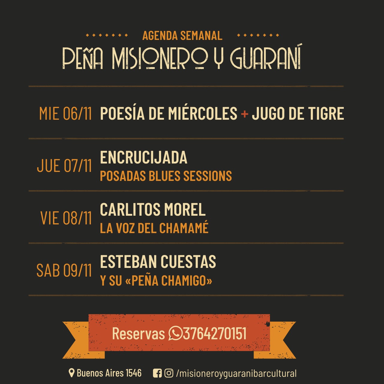 Una de las mejores voces misioneras y acompañante de grandes como Raúl Barboza y Luis Ángel Monzón llega este viernes y por primera vez a Misionero y Guaraní. La semana arranca el miércoles con Poesía de Miércoles y Jugo de Tigre como invitado especial. El jueves, una nueva Posadas Blues Session y el sábado, Esteban Cuestas y su Peña Chamigo.