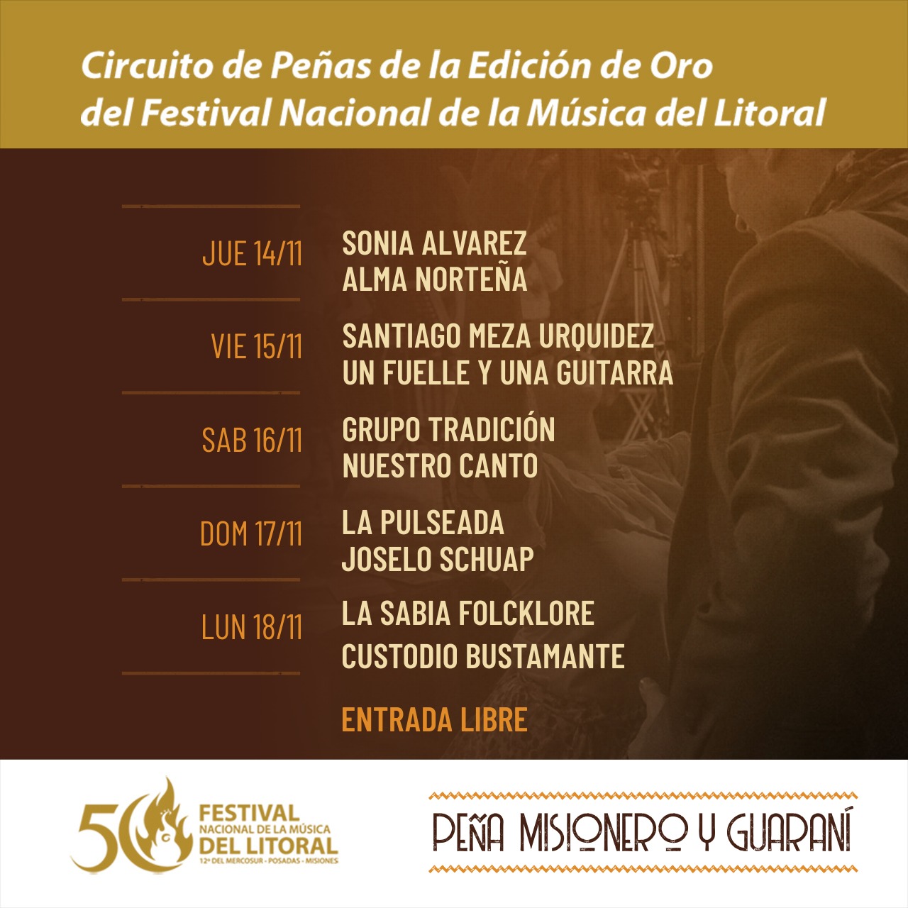 50 ediciones del Festival del Litoral no son poca cosa, y este año la organización ha actuado en consonancia a tan importante fecha, dotándole a nuestro festival mayor de una brillo y una organización, nunca antes vista. Así, Misionero y Guaraní, en consonancia con la propuesta de la municipalidad, se ha sumado al Circuito de Peñas, albergando a músicos y parroquianos que, además de los espectáculos programados en el Anfiteatro Manuel Antonio Ramirez, girarán por la ciudad en busca de más chamamé, polkas, guaranias, sambas, chacareras e incontables ritmos más, a los que la peña potenciará con su calidez característica y las mejores empanadas de la comarca.