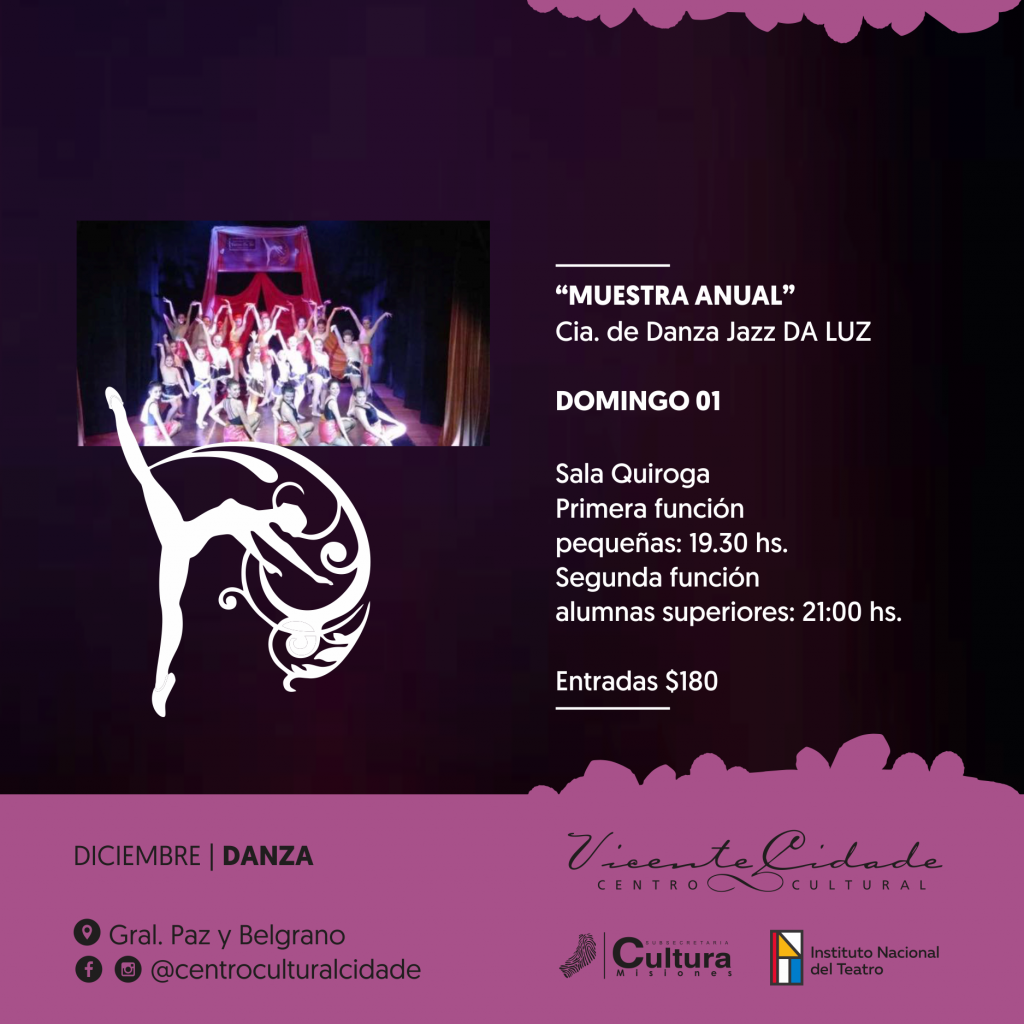 El domingo 1º de diciembre en la Sala Quiroga del Centro cultural Cidade, el público podrá disfrutar de la muestra anual de la compañía de jazz Da luz, en la cual habrán exhibiciones de las diferentes coreografías realizadas por los alumnos de los diferentes niveles, en esta gala se estrenará la obra “magia y embrujos”. La primera función de los más pequeños será a las 19:30 horas y la de las alumnas de los años superiores será a las 21:00 horas. Precio de entrada: $180.