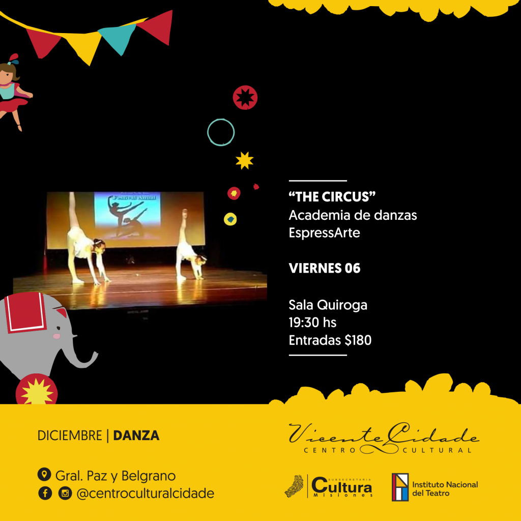 The Circus en el Cidade: El viernes 6 de diciembre a las 19:30 horas en la Sala Quiroga del Centro cultural Cidade, la academia de danzas “EspressArte” presenta el espectáculo denominado “The Circus”, en el cual alumnos de la academia recrearán la magia del “Circo” en diferentes modalidades de danzas.