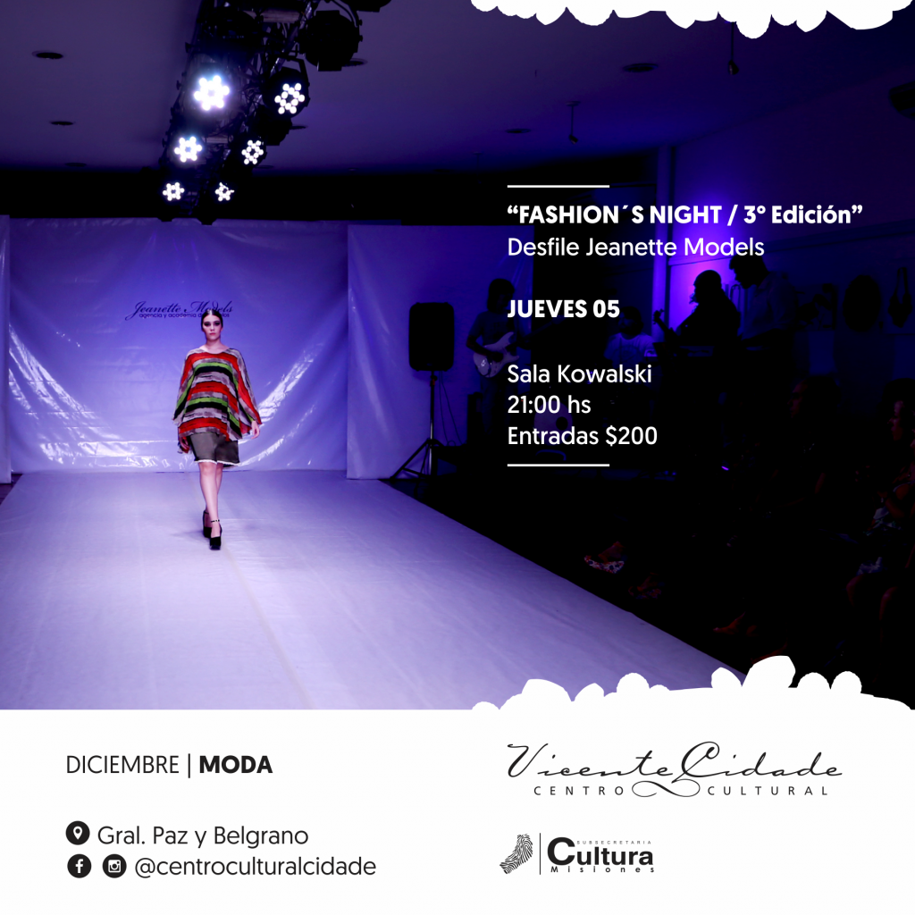 El jueves 5 de diciembre a las 21:00 horas en la Sala Kowalski del Centro cultural Cidade, se realizará la tercera edición del Fashion´S Night, un desfile al estilo europeo, música instrumental en vivo y los mejores diseños en pasarela. Precio de entrada: Anticipadas $150, en puerta $200.