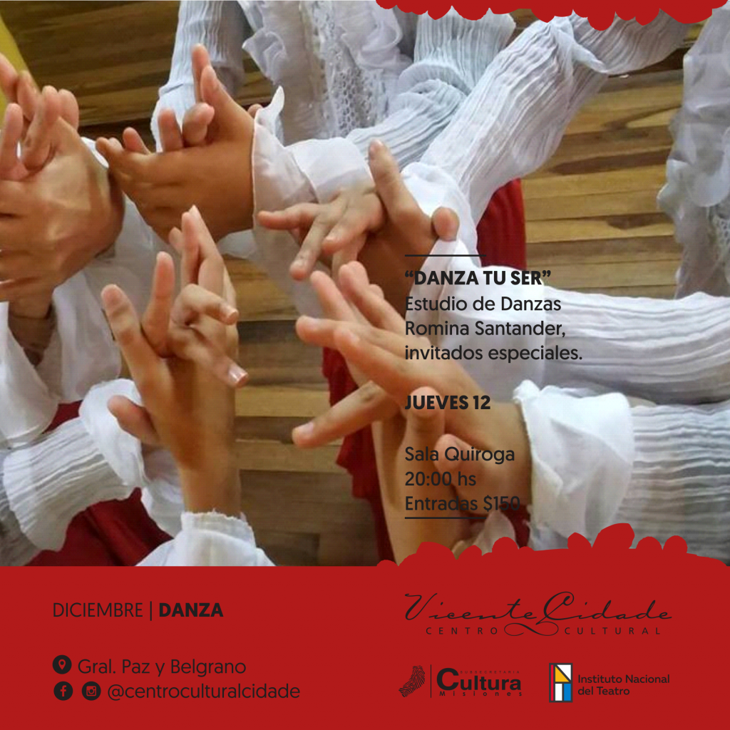 Danza tu ser en el Cidade: El jueves 12 de diciembre a las 20:00 horas en la Sala Quiroga del Centro cultural Cidade el Estudio de danzas de Romina Santander realizará su gala de fin de año denominada “Danza tu ser”. Precio de entrada $ 150.
