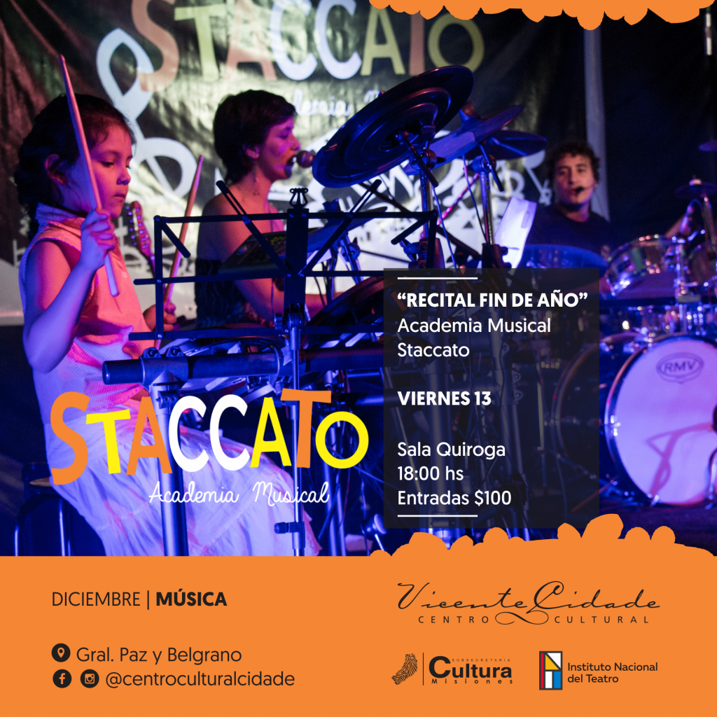 El viernes 13 de diciembre a las 18:00 horas en la Sala Quiroga del Centro cultural Cidade se llevará a cabo el recital de los alumnos de Academia Staccato, donde se podrá apreciar todo lo aprendido en el año y disfrutar de una amplia gama de géneros musicales elegidos por ellos mismos. Precio de entrada: $100